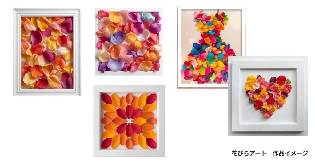 今回のオープンセミナーでは、色とりどりの本物の「花びら」を主役にしたアート活動を行います。プリザーブドフラワーの花びらを使用するので、持ち帰ってからも風合いが変わらず、長く飾っていただけます。